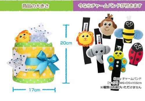 ■このおむつケーキの装備アイテム ミキハウス 今治ミニタオル 1枚 Sassy チャームバンド 1個 メッセージカード(印刷対応のみ) アートフラワー■紙おむつの メーカーと枚数 「パンパース」×7枚 おむつのサイズはS,M,Lからお選びいただけます。 ※パンツタイプをお選びの場合は5枚となります ☆目安☆ Sサイズ(4-8kg) Mサイズ(6-11kg) Lサイズ(9-14kg) ■おむつケーキのサイズ 直径約17cm×高さ約20cm