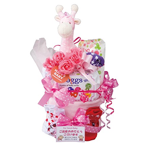 たまごケースに入ったオランダ発のキュートでポップなカラフルソックス「Soggs」と、思わず抱っこしたくなるやさしいぬいぐるみ「ミンクプラッシュ」をキュートに飾りつけた、ボリューム満点のおむつケーキです。 きりんのぬいぐるみは赤ちゃんが喜ぶ「ガラガラ」入りです。 また、おしりにやさしい「おしりふき」はカラフルなパッケージが魅力的です。 紙おむつはパンパースのSサイズを13枚使用しています。