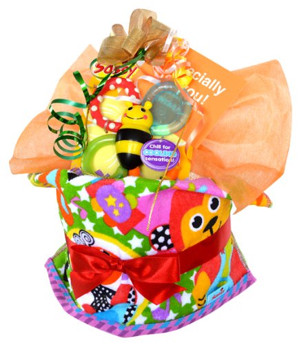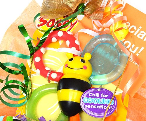 1981年の創業以来、世界の赤ちゃんに愛され続けるSassy。視覚や聴覚などを刺激して、お子様の成長に必要不可欠な能力を遊びながら発達させ、引き上げることをコンセプトに研究・開発しています。そのSassyの人気NO.1ハチさんの歯固め「バズンバイツ」の入ったおむつケーキが登場しました。羽の部分をかぷっと手前に傾けるとブルブルと振動。冷蔵庫に入れるとヒンヤリします。