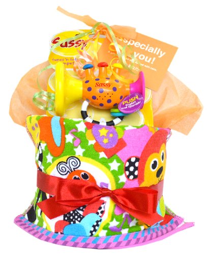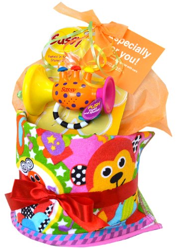 1981年の創業以来、全世界の赤ちゃんに愛され続けるSassy。視覚や聴覚などを刺激して、お子様の成長に必要不可欠な能力を遊びながら発達させ、引き上げることをコンセプトに研究・開発しています。そのSassyの人気のミュージックトイ「チューン・トランペット」が入ったおむつケーキが登場。ボタンを押すと英語・スペイン語、音楽が!鏡付き。
