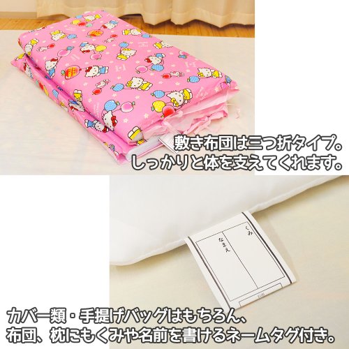 カバー類、手さげバッグはもちろん布団・まくら本体にもすべて「くみ・なまえ」を書けるネームタグ付き!