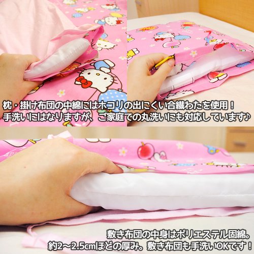 - [組成]【掛け布団】側地:ポリエステル100%、詰め物:ポリエステル100%(0.35kg)【敷き布団】側地:ポリエステル100%、詰め物:ポリエステル100%(0.8kg)【まくら】側地:ポリエステル100%、詰め物:ポリエステル100%【掛け布団カバー】綿100%【敷き布団カバー】綿100%【枕カバー】綿100%【手提げバッグ】ポリエステル100%