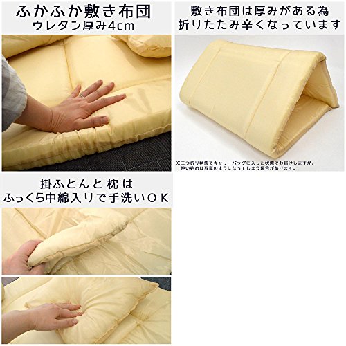 - 【サイズ/商品重量】 1)掛カバー/約79×109cm/約135g 2)掛ふとん/約78×108cm/約250g 3)敷カバー/約69×119cm/約130g 4)敷ふとん/約68×118cm/約450g 5)枕カバー/約28×33cm/約20g 6)枕/約27×32cm/約65g 7)キャリーバッグ/約65×42×14cm/約200g