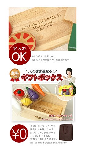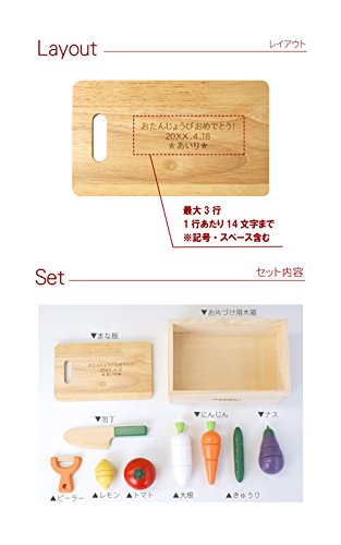 - セット内容:木製まな板、お片付け用木箱、包丁・ピーラー・レモン・トマト・大根・にんじん・きゅうり・ナス