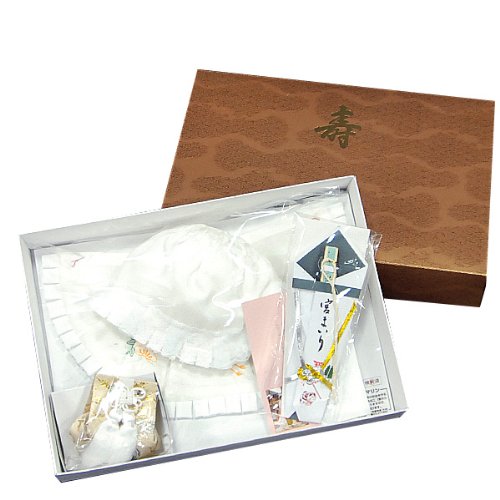 お宮参りの時、赤ちゃんに付ける頭巾とよだれ掛け、祝い着の紐に掛けるお守りと末広の4点セットです。