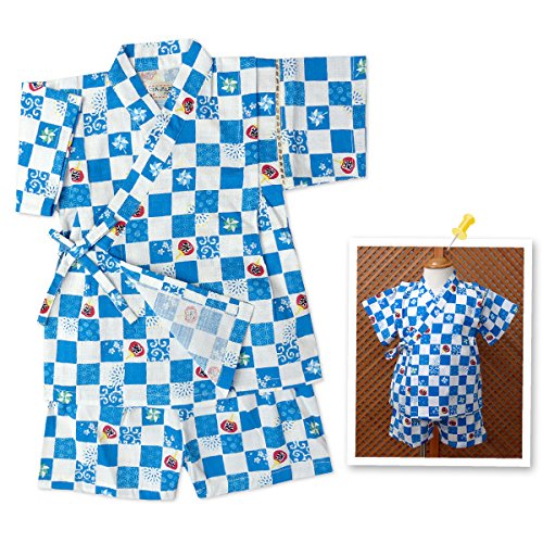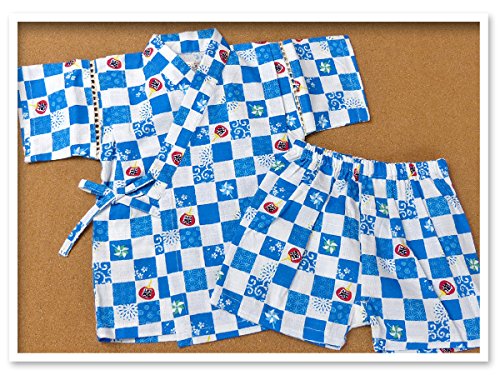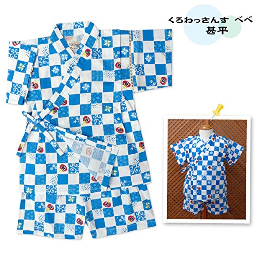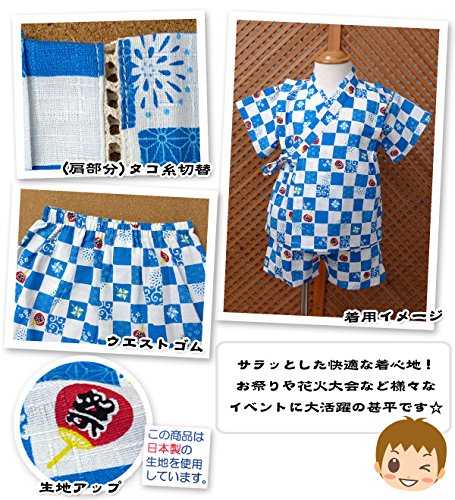 ベビー服 男の子 甚平 くろわっさんすべべ うちわと風車柄 生地日本製 綿100% タコ糸切替 上下組セット 男児 ベビー (ブルー/90cm)