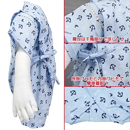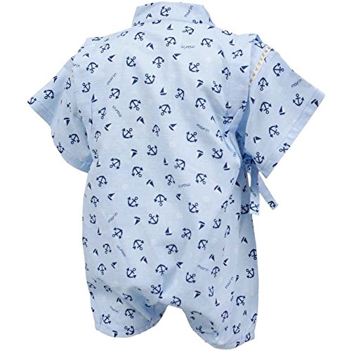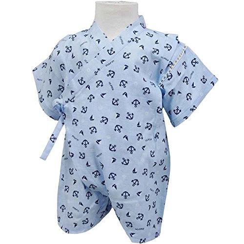 カラー : サックス / ボーイズベビーマリン柄甚平ロンパースタイプ(日本製生地使用、中国縫製) / ・ 赤ちゃんのお肌に優しい綿100%の日本製生地使用 / ・ マリン柄のロンパースタイプの甚平 / ・ 肩口は千鳥掛けで涼しい / ・ 上着は内掛け、外掛け紐でカンタン着用 / ・ 股下はスナップボタン留めで、着脱やオムツ替えが簡単! / ・ お祭りや花火大会だけではなく、普段着やパジャマとしても大活躍! / 綿 100%(日本製生地)
