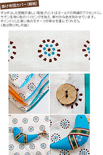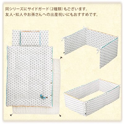 ポコポコした感触が楽しい発砲プリントはゴールドの刺繍がアクセントに。サテン生地に色のパイピングを加え、鮮やかな色を効かせています。ポイントにした青い鳥のモチーフが幸せを運んでくれそう。同シリーズにサイドガード(2種類)もございます。
