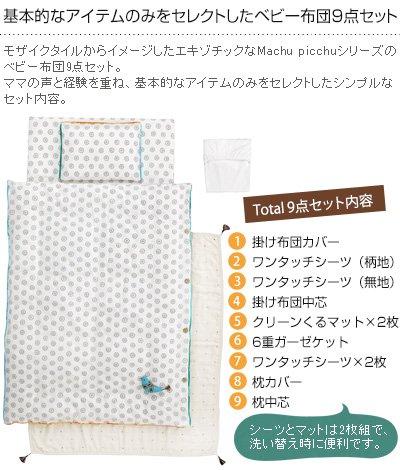 モザイクタイルからイメージしたエキゾチックなMachu picchuシリーズのベビー布団9点セット。ママの声と経験を重ね、基本的なアイテムのみをセレクトしたシンプルなセット内容です。