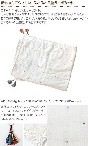 ふわふわの6重ガーゼに6色の糸を織りこんだ、小さなクロス柄がキュート。四隅のマルチカラーのタッセルがアクセントになっています。パイピングテープにも柄を織り込んであり、繊細なハンドワークにぬくもりを感じます。