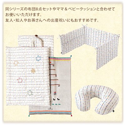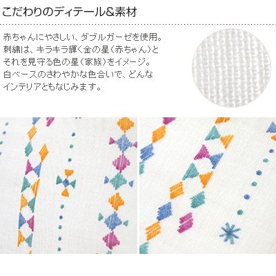 赤ちゃんにやさしい、ダブルガーゼを使用。刺繍は、キラキラ輝く金の星(赤ちゃん)とそれを見守る色の星(家族)をイメージ。白ベースのさわやかな色合いで、どんなインテリアともなじみます。同シリーズの布団8点セットやママ&ベビークッションと合わせてお使いいただけます。