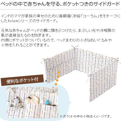 元気な赤ちゃんがベッドの柵に頭をぶつけたり、まぶしい光や冷暖房の風が直接当たるのを防ぎます。内側にポケットがついているので、ベッドまわりの小さなぬいぐるみや小物を入れることができます。