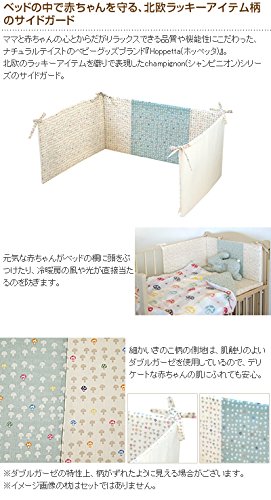 北欧のラッキーアイテムを織りで表現したchampignon(シャンピニオン)シリーズのサイドガード。元気な赤ちゃんがベッドの柵に頭をぶつけたり、冷暖房の風や光が直接当たるのを防ぎます。細かいきのこ柄の側地は、肌触りのよいダブルガーゼを使用しているので、デリケートな赤ちゃんの肌にふれても安心。同シリーズのベビー布団8点セットと合わせてお使いいただけます。友人・知人やお孫さんへの出産祝いにもおすすめです。
