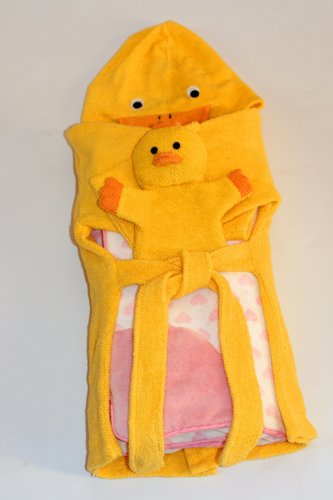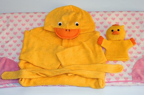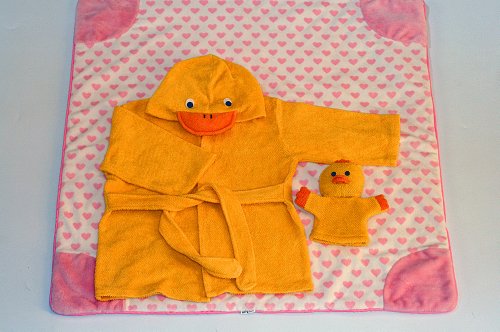 ご出産祝い 内祝い ベビークレープコレクション バスローブ ブランケット 布のおもちゃ あひるのバスローブ/ バスミトン ハート柄ピンクのブランケット 3点組み