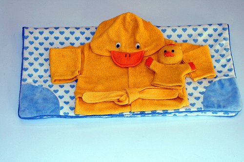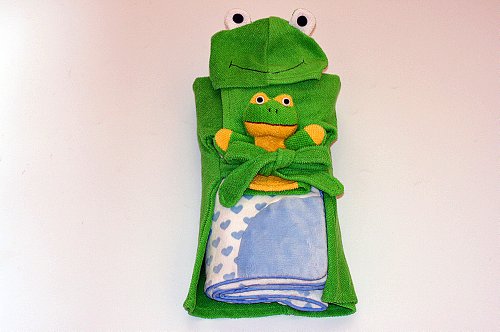 ご出産祝い 内祝い ベビークレープコレクション バスローブブランケット 布のおもちゃ かえるのバスローブ/バスミトンハート柄ブルーのブランケット 3点組み