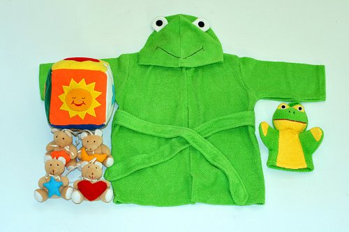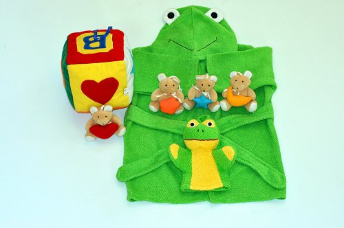 ご出産祝い 内祝い ベビークレープコレクション バスローブ 布のおもちゃ かえるのバスローブ/バスミトン ブロックとくまのマスコット 4点組み