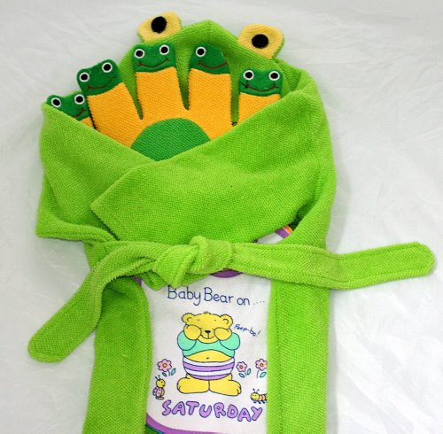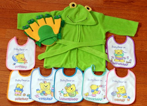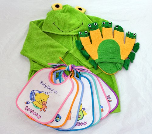ご出産祝い 内祝い ベビークレープコレクション バスローブ/よだれかけ/布玩具 かえるのバスローブ/ウィークリービブセットかえるグローブ 3点組み