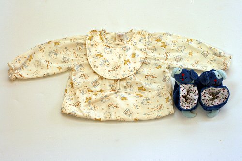 お食事エプロン えりママのスモックエプロン(ビブ付き) おしゃれなお食事エプロン/ ブーティ 長袖スモック ブルー12M/ ラトル入りアニマルシューズ 13CM えりママギフトセット 2種類組み.