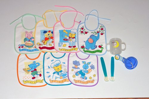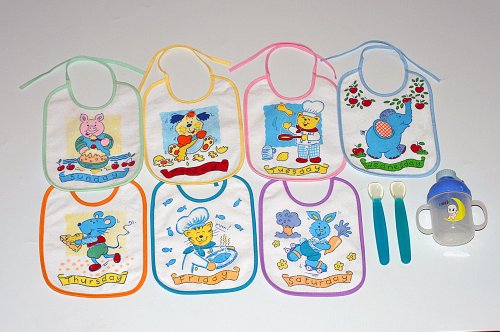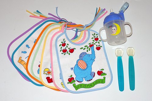 お食事タイムセット ご出産祝い エプロン トレーニングカップ/ スプーン ウィークリービブ7枚セット/ ポップアップトレーニングカップ/ ベビーシリコンスプーン2本組み