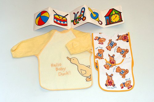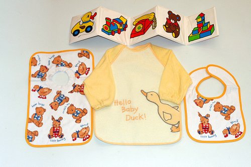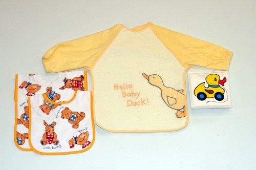 お食事エプロン よだれかけ 長袖お食事エプロン/ プルオーバービブ/ベルクロビブセット/ おまけ付きお風呂絵本 ダック柄/グース・バニー・ベア柄 お食事タイムセット/ おまけ付きバスタイムえほん 3点プラスおまけ付き