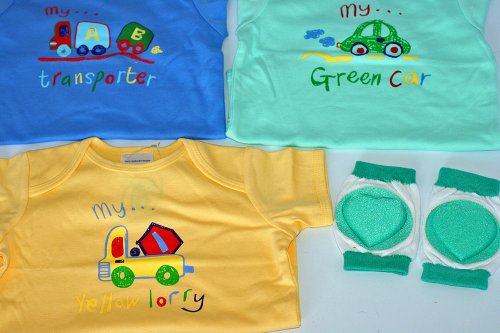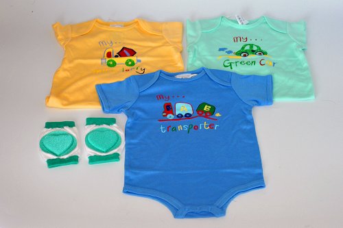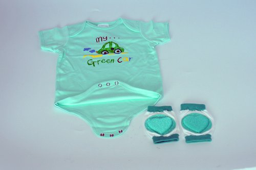 肌着 ひざあて ボーディスーツ/ニーパッド のりもの柄 グリーンのハート 4点セット