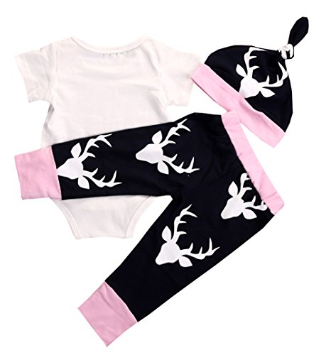 ベビー 女の子 oh deer i'm here プリント ロンパース  鹿 レギンス パンツ コットン 帽子三点セット ファッション 色  (0-3月, 画像色)
