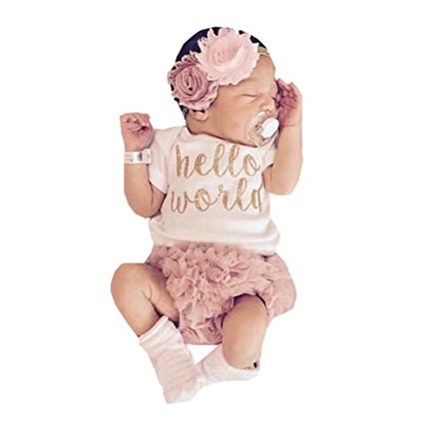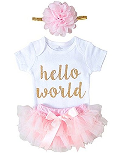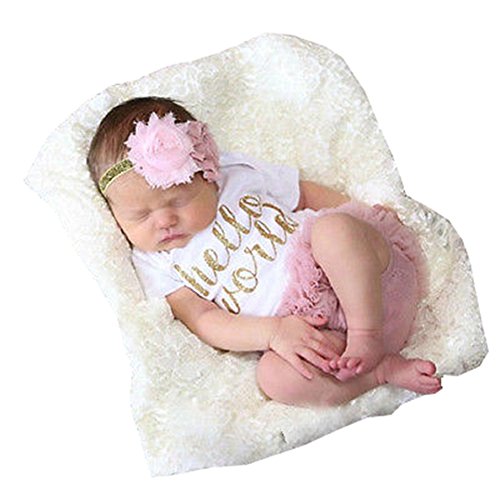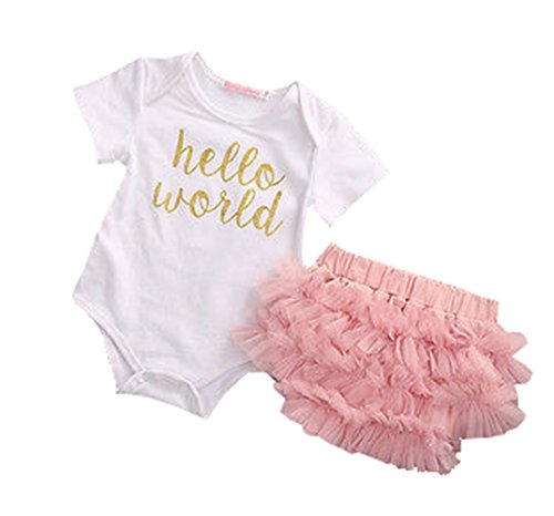 可愛い 新生児 女の子 ヘッドバンド Hello World プリント ロンパース ショート パンツ 三点 セット (12-18月, ピンク)