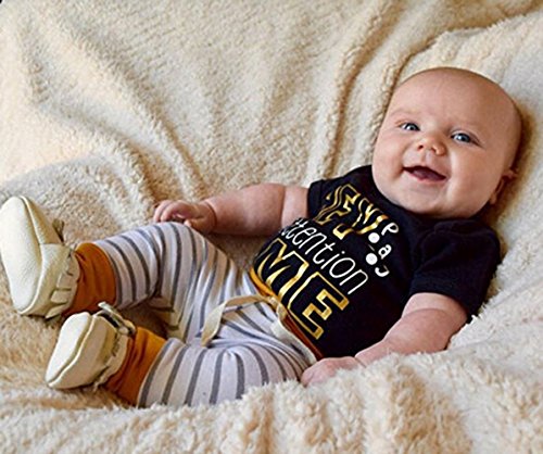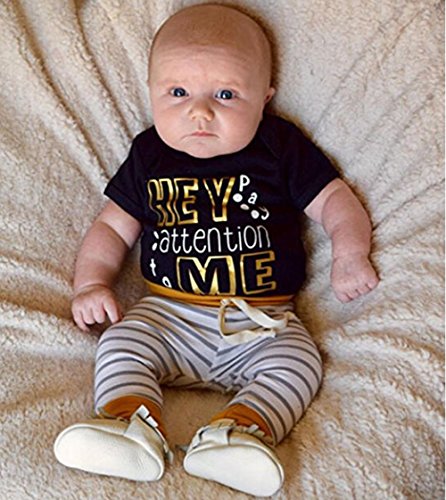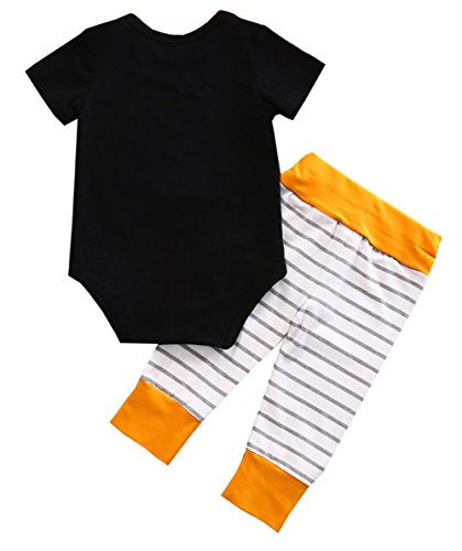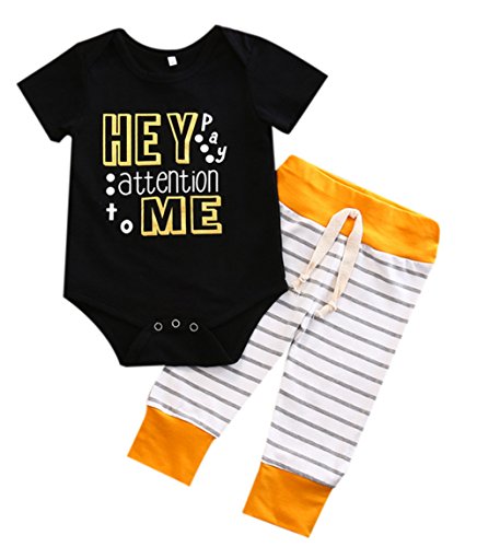 赤ちゃん 半袖 ロンパース ストライプ ズボン 二点 セット ベビー 可愛い HEY プリント ロンパース 縞 ロングパンツ (12-18月, 黒)