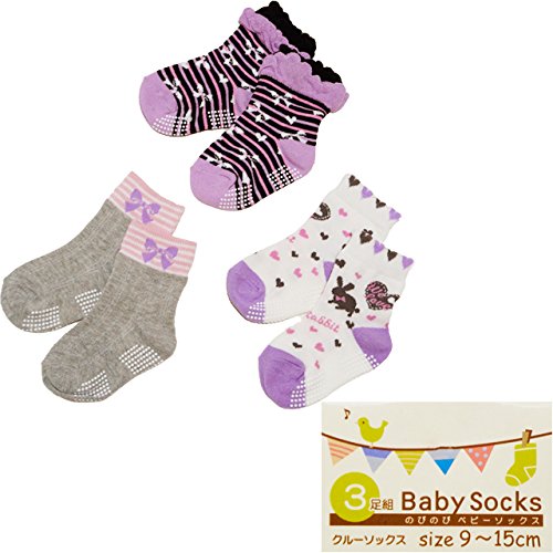 【3足セット】女児 クルーソックス【ボーダーリボン・うさぎハート】 ボーダーリボン-うさぎ◇9-15cm