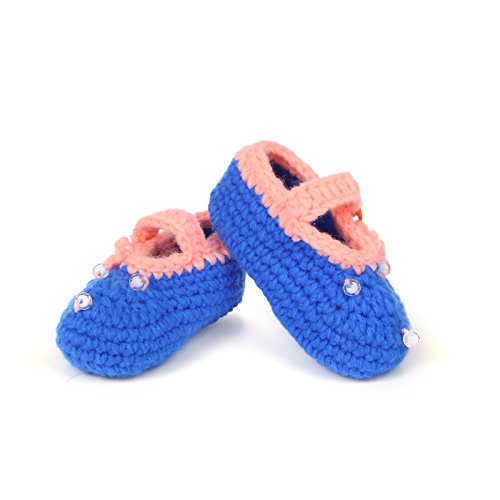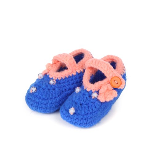 Yuelian 手編みベビーシューズ ビーズ+花 ボタン靴ひも付き (ブルー)