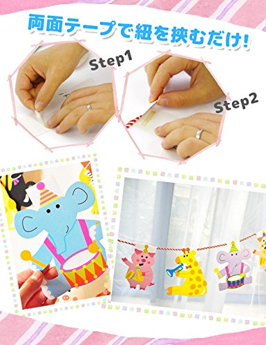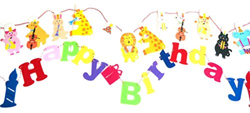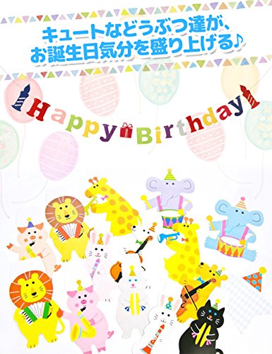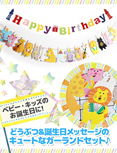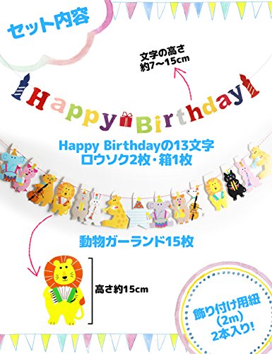 - 商品内容:動物ガーランド15枚、高さ約15cm、Happy Birthdayの13文字、ロウソク2枚、箱1枚の16文字(高さ約7~15cm),紐(2m) 2本