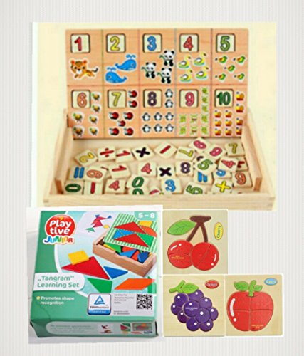 [算数セット ] 算数と時間を学習出来て、数字と数量を理解するのに役立つアイテムです。 数字だけでなく、輪っかも付いているので、目で見て動かして増減を学習できます。 手先を動かすことで、脳を刺激し右脳教育につながります。 また黒板もついていて、先生ごっこなども可能です 内容:数字、符号70個・輪っか55個・チョーク3個・黒板拭き1個 サイズ:28×18×2 輸入品のため多少写真とは色合いや質が異なりますが中身は問題ありません。 小さい部品を飲み込まないようにご注意下さい。 [パズル] タングラムパズルです。 様々な組合わせを考えてつくりあげることにより創造性を養います。 七田式やモンテッソリーノ教育などによく利用されていて、小さい子どもでも楽しんであそぶことができます。 また乳幼児用に木のパズルも3枚あります。 色の刺激をあたえることにより感性を豊かにします。 新品 送料無料 幼児 おもちゃ 幼児教材 知育 玩具 算数セット
