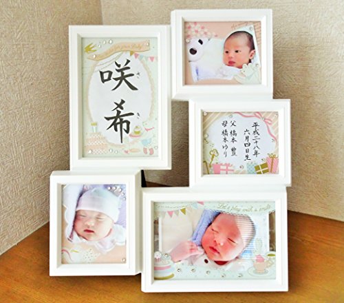 スワロフスキーが付いた可愛らしいフォトフレームを命名書にしました。 心を込めて丁寧にお書きします。 名前・生年月日の書かれた2つの枠は、後に写真に入れ替えて使用することもできるので、長く使用することも可能です。 画像の赤ちゃんの写真部分は、お客様のお手元に商品が届いた際、ご自身でお好きな写真を入れていただけます。 ◇色 白枠×ピンク ◇サイズ H33×W27.5×D2.6 ◇重さ 712g *手漉きの和紙に書きます。 裏面に壁掛け用金具もあるので、壁掛けもできます。 (紐は付属しておりません。) *名前、生年月日とは別に17字以内でお好きなメッセージをお入れします。(身長・体重・父母の名前など...) *文字種1.2.4から字体をお選びいただけます。 *色違いの水色も出品しております。