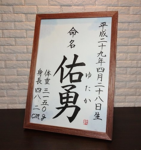 命名紙 水色 太字 赤ちゃんの誕生に命名書 フレーム付き ブラウン 落款印あり