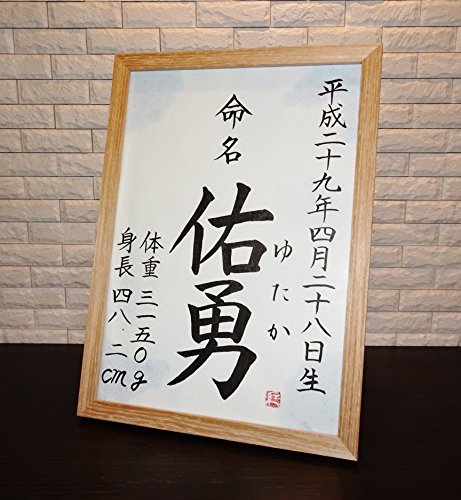 命名紙 水色 太字 赤ちゃんの誕生に命名書 フレーム付き ナチュラル 落款印あり