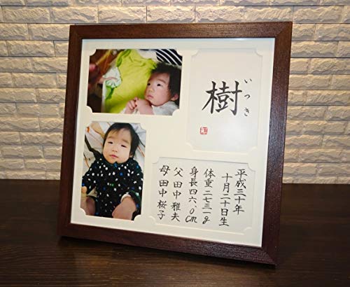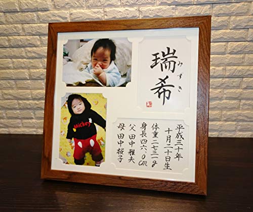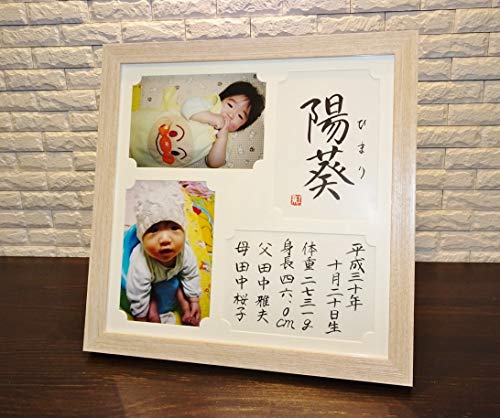 木枠のフォトフレームなので、インテリアにもなじみやすいです。 品もありとても可愛らしい命名書。 心を込めて丁寧にお書きします。 画像にある赤ちゃんの写真部分は、お客様のお手元に商品が届いた際、ご自身でお好きな写真を入れていただけます。 身長・体重・赤ちゃんへのメッセージなどを40字以内で入れることができます。 ◇サイズ H26×W26×D2cm◇重さ 610g *手漉きの和紙に書きます *裏面に壁掛け用金具もあるので、壁掛けも可 (紐は付属しておりません) *文字種1・2・4から字体をお選びいただけます(1枚目の画像〈瑞希〉は文字種2、2枚目〈樹〉は文字種1、3枚目〈陽葵〉は文字種4です) *こちらの商品の落款(雅印)なしのページもございます。 印なし(-300円)をご注文の方はそちらのページからのご注文をお願いいたします。