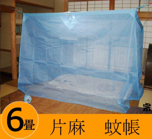 日本製 奈良の特産 国産蚊帳 片麻 6畳用 水色 6帖用【吊り手無料サービス】