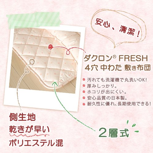 ■サイズ:70×120cm ■側生地:ポリエステル65%、綿35% ■詰め物:ポリエステル100%(ダクロン(R) FRESH 4穴 中わた)中綿量:0.8kg ■ネームタグ付き ■日本製 ※2018年4月より原綿名称の表記方法が変更になっています。