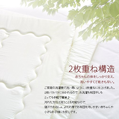 清潔・安心・ウォッシャブル! 赤ちゃんにも安心♪ 今まで出来なかった敷き布団のお洗濯をご家庭で。 ご家庭で簡単に洗える敷布団です。 ダニ防止・ホコリ防止・アレルギー対策に! 新生児の赤ちゃんや、アトピー・喘息(ぜんそく)でお悩みの小さなお子様にも、安心してご使用頂けます。 ホコリがたちにくいから快適♪ テイジンV-lap 綿シート使用 ご家庭の洗濯機で洗い易いように、2枚合せに仕上げました。 バラバラに分割出来るので、お洗濯も干すのも簡単♪ 汚れた方だけ洗うことも可能なので、寝汗やおねしょ、よだれ等でお布団を汚しやすい赤ちゃんや小さなお子様にも安心です。 特殊加工を施したテイジンV-lap綿は、へたりにくく、しっかりと赤ちゃんを支えるので安心です。 適度な弾力と硬さで、産まれたばかりの新生児からご使用頂けます。 超極細特殊繊維 [マイクロマティーク生地]を使用しているので、速乾性抜群の上、静電気も起こしにくいのでホコリも寄せ付けません。生地の摩擦による小さなホコリの発生も防ぎ、アレルギー対策に絶大な効果を発揮します。 日本国内の布団工場にて加工した、信頼の日本製の布団です。