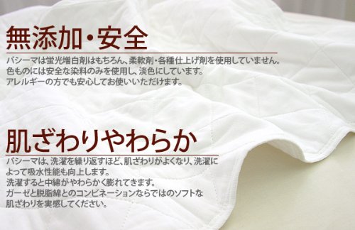 - ■特徴 ・ご家庭の洗濯機で丸洗いOK! ・ 「エコテックス」クラス1認証 だから安全。 ・脱脂綿・ガーゼ素材の、抜群の通気性と吸湿性で、夏は涼しく、冬はムレずに、一年を通して快適にご使用いただけます。 ・医療用に使用される、脱脂綿とガーゼが素材だから安心。 ・アトピー・アレルギーの原因物質を含まず、安心してご使用いただけます。 ・蛍光増白剤はもちろん、柔軟剤や各種仕上げ剤、糊も使っていない、無添加素材。 ・速乾性に優れているから、洗濯後の乾きが早い。 ・脱脂綿には、睡眠中に身体から出る汗・ガス・臭いやほこり汚れを吸収するなどの優れた清浄効果があります。 ・干すときは、縮まないように両手で軽く伸ばしてください。