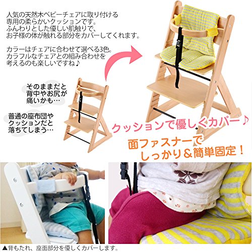 - 人気の天然木ベビーチェアに取り付ける専用の柔らかいクッションです。ふんわりとした優しい肌触りで、お子様の体が触れる部分を優しくカバーしてくれます。かわいいカラーで、チェアとの組み合わせも楽しめます。面ファスナーでの取り付けなので、簡単に取り外しができ、お洗濯もラクラク!汚れやすいものだからうれしいですね♪※ベビーチェアは別売です。