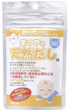 ●【商品説明】●「まつやの天然だし 30g」は、いわし、こんぶ、かつお、椎茸を原料に、自然の旨味をそのままパックした天然だしです。●化学調味料や酸化防止剤などは、使用していません。●さとうきび由来の食物繊維、ヘミセルロースをプラス。●【使用方法】●小さじすりきり1杯(約2g)にお湯25ccを加えて溶かします。●(お好みで天然だしやお湯の量を加減してください)●【保存方法】●直射日光を避け、常温で保存してください。●開封後は冷蔵庫に保存してください。●【まつやの食品とは】●安心(無添加)・素材の力(栄養強化)・おいしさ(味わい)の3つの調和をお届けすることをモットーに開発されました。●ベビーフードでは赤ちゃんの健やかな成長を願って素材を徹底的に吟味。●また、非常食(保存食)では、新潟中越地震の実体験を活かし、被災地の声を聞きながら、簡単でありながら味わいある、そして環境に配慮した防災食を提供しています。●【ご注意】●お湯の取り扱いにご注意ください。●食べ残しや作りおきはあげないでください。●開封後は2週間を目安にお召し上がりください。●離乳食の進め方に...