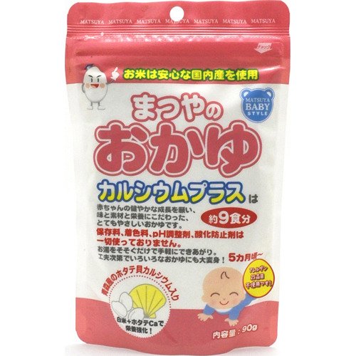 ●【商品説明】●「まつやのおかゆ カルシウムプラス(5ヶ月頃から) 約9食分」は、日本産原料米を使用したベビーフード ごはん類(5ヶ月頃から)です。●アレルゲン27品目(特定原材料7品目、特定原材料に準ずるもの20品目)不使用。●お湯でかきまぜるだけの簡単調理。●炊立て風の香りが自慢です。●ホタテ貝殻のカルシウム入り。●プレーンタイプで離乳食のベースに多用できます。●対象月齢5ヶ月頃から。●軽くてかさばらないので、お出かけの時などにも。●【保存方法】●直射日光を避け、常温で保存してください。●【お召し上がり方】●離乳初期(5-6ヶ月):おかゆ大さじ山盛り1杯に、お湯大さじ5、6杯を注ぎ、混ぜます離乳中期(7-8ヶ月):おかゆ大さじ山盛り1杯に、お湯大さじ4、5杯を注ぎ、混ぜます離乳後期(9-11ヶ月):おかゆ大さじ山盛り1杯に、お湯大さじ3杯を注ぎ、混ぜます●【使用上の注意】●お湯の取り扱いにご注意ください。●食べ残しや作りおきはあげないでください。●開封後は湿らないようにチャックを閉じて保存してください。●まれに黒褐色の小片が見られることがありますが...