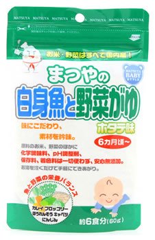 名 称 まつや はじめてのごはん まつやの白身魚と野菜がゆ 内容量 60g 特 徴 お湯を注ぐだけで簡単にできあがる、離乳が進んできた赤ちゃんにオススメのおかゆです。 国内産の水稲うるち米に良質なタンパク質やビタミン類を含む白身魚(カレイ)と4種類の国産野菜(ブロッコリー、ほうれんそう、キャベツ、ニンジン)をブレンドして、お米本来の味わいを大切に、マイルドなホタテ味に仕上げました。 化学調味料、pH調整剤、保存料、着色料は一切使っていません。 原材料 国内産水稲うるち米、カレイ、ブロッコリー、ほうれん草、キャベツ、にんじん、食塩、ホタテエキス 栄養成分 (100g当たり) エネルギー380kcal、たんぱく質7.3g、脂質1.6g、炭水化物84.0g、ナトリウム620mg、水分5.4g、灰分1.7g 区 分 ベビーフード、おかゆ/原産国 日本 ご注意 使用上の注意 ・お湯の取り扱いにご注意ください。 ・食べ残しや作りおきはあげないでください。 ・まれに黒褐色の小片が見られることがありますが、お米の胚芽部分ですので心配ありません。 保存の注意 ・開封後は湿らないようにチャックを閉じて保存してください。 ・直射日光を避け、常温で保存してください。 本品記載の使用法・使用上の注意をよくお読みの上ご使用下さい。JANコード:4510549002435