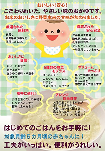 そして、 良質な新潟県産水稲米に5種類の野菜(ほうれんそう、こまつな、にんじん、かぼちゃ、ブロッコリー)をプラス。