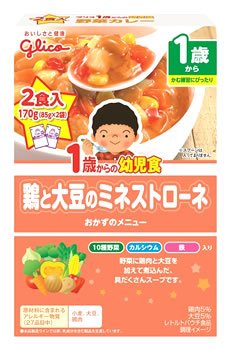 ●【商品説明】●「1歳からの幼児食 鶏と大豆のミネストローネ 2食入」は、野菜に鶏肉と大豆を加えて煮込んだ、具だくさんスープ(ベビーフード)です。●10種類の野菜を食べやすい大きさ・形・固さにして使用しています。●うす味で素材の風味や色・香りを生かしています。●着色料、保存料、香料、化学調味料は使用していません。●幼児期は食生活の基礎づくりをする大切な時期です。●「1歳からの幼児食」は、幼児期の特性に配慮していますので、お子様にも安心して召し上がっていただけます。●【原材料に含まれるアレルギー物質】●小麦※本品製造ラインでは卵、乳成分を含む製品を生産しています。●【お召し上がり方】●【作り方】■お湯で温める場合中袋の封を切らずに、沸騰させて加熱を止めたお湯に入れて1-2分温めます。●■電子レンジで温める場合必ず深めの容器に移しかえラップをかけて加熱します。●容器、加熱時間等は電子レンジの説明書を参考にしてください。●調理済みですので、温めずにそのままでも召し上がれます。●【ご注意】●開封時やラップをとる際などには、熱くなった中身がはねることがありますので、...