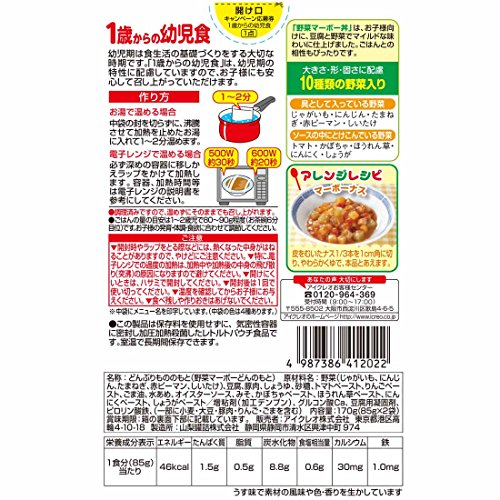 - 原材料:野菜(じゃがいも、にんじん、たまねぎ、赤ピーマン、しいたけ)、豆腐、豚肉、しょうゆ、砂糖、トマトペースト、りんごペースト、ごま油、水あめ、オイスターソース、みそ、かぼちゃペースト、ほうれん草ペースト、にんにくペースト、しょうがペースト/増粘剤(加工デンプン)、グルコン酸Ca、豆腐用凝固剤、ピロリン酸鉄、(一部に小麦・大豆・豚肉・りんご・ごまを含む)