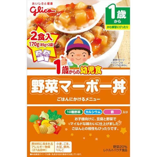 ●【商品説明】●「1歳からの幼児食 野菜マーボー丼 2食入」は、お子様向けに、豆腐と野菜でマイルドな味わいに仕上げたベビーフード(1歳頃から)です。●ごはんとの相性もぴったりです。●10種類の野菜をたべやすい大きさ・形・固さにして使用しています。●うす味で素材の風味や色・香りを生かしています。●幼児期の特性に配慮していますので、お子様にも安心して召し上がっていただけます。●着色料、保存料、香料、化学調味料は使用していません。●野菜20%。●賞味期限等の表記について西暦年/月/日の順番でパッケージに記載。●【お問い合わせ先】●販売者アイクレオ株式会社〒108-0074東京都港区高輪4-10-18アイクレオお客様センター0120-964-369受付時間 (9:00-17:00)●【原産国】●日本●【原材料名・栄養成分等】●品名・名称:どんぶりもののもと原材料名:野菜(じゃがいも、にんじん、たまねぎ、赤ピーマン、しいたけ)、豆腐、豚肉、しょうゆ、砂糖、トマトペースト、りんごペースト、ごま油、水あめ、オイスターソース、みぞ、かぼちゃペースト、ほうれん草ペースト、にん...