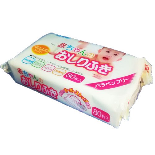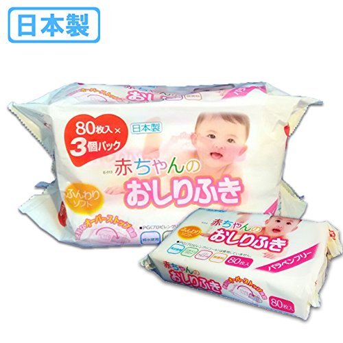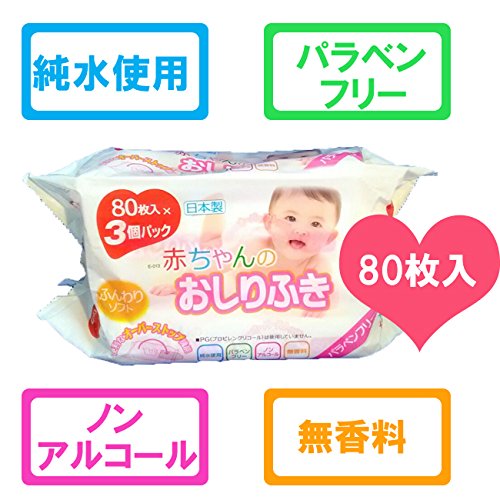 国産の赤ちゃんのおしりふき80枚入り×3個パックです。 2セットからの販売とさせていただいます。 パラベン・アルコール・香料・PG(プロピレングリコール)不使用で、赤ちゃんの肌に優しい安心安全な純水使用です。 ふんわりソフトタイプで、持運びに便利なオーバーストップ機能付き。 使用方法 ・オープンシールを折れ曲がる位置までゆっくり剥がして一枚ずつ取り出してください。 ・無理にはがしたり、強い力で引っ張るとシールが破れたり閉まりにくくなる場合があります。 ・使用後は隙間が出来ないように、シールをしっかり閉めて下さい。