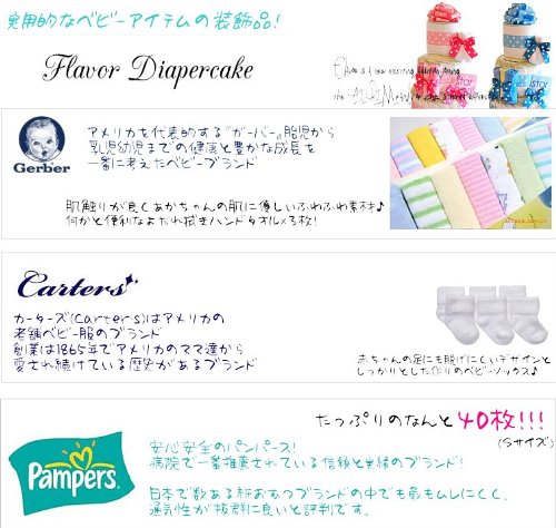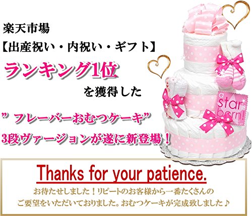大好評により日本テレビ「ヒルナンデス!」で紹介されたおむつケーキ! たくさんのリピーターのお客様よりご要望いただいておりました。フレーバーおむつケーキの3段ヴァージョンが完成いたしました。 シンプルでエレガントさらに豪華になったワンランク上のおむつケーキ♪ 7色で新登場!! 紙おむつ(パンパース)の枚数が多く、上品なデザインでかわいいと評判の出産祝いギフト! 当店のダイパーケーキデザイナー自慢の作りの綺麗さは先方様にも喜んでいただけます。相手の好み等気にせずに贈れるオムツケーキギフトです。 迷ったらこのおむつケーキで決まり!!! 自信を持ってオススメしております。